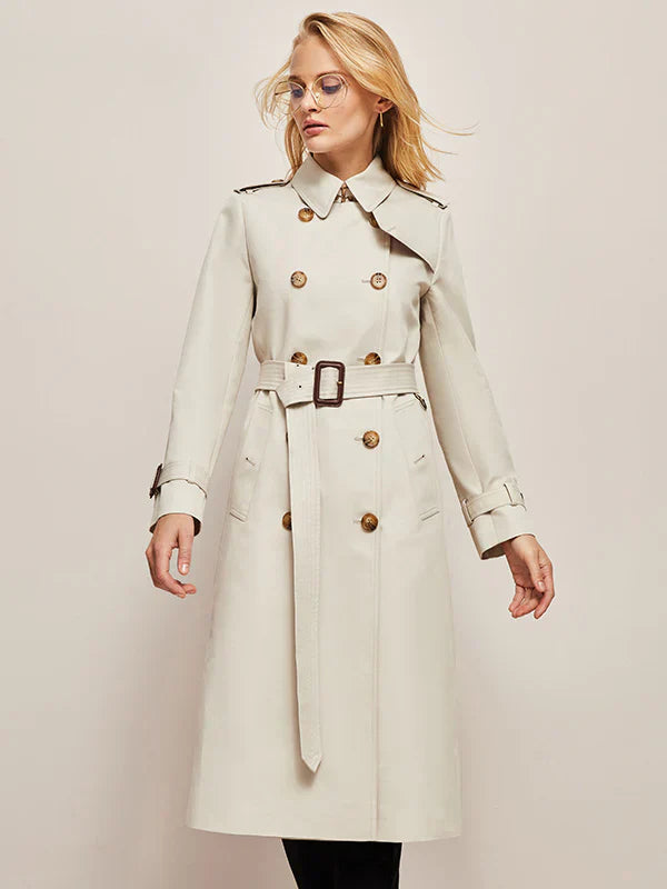 Maintain elegance with this classic double-breasted trench coat. Designed with iconic details such as shoulder epaulets, a storm flap, and cuff straps, this coat is a wardrobe essential that helps you create polished, sophisticated outfits. Available in two refined shades – beige and cream – it radiates timeless elegance for any occasion.